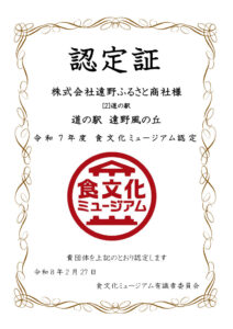 文化庁の食文化機運醸成事業「100年フード」において、遠野市独自の食文化を未来へ継承する取り組みやその食の魅力が評価され、「遠野ジンギスカン」が令和7年度「未来の100年フード部門~目指せ、100年!~」に認定され、「道の駅遠野風の丘」が「食文化ミュージアム」に認定されました。